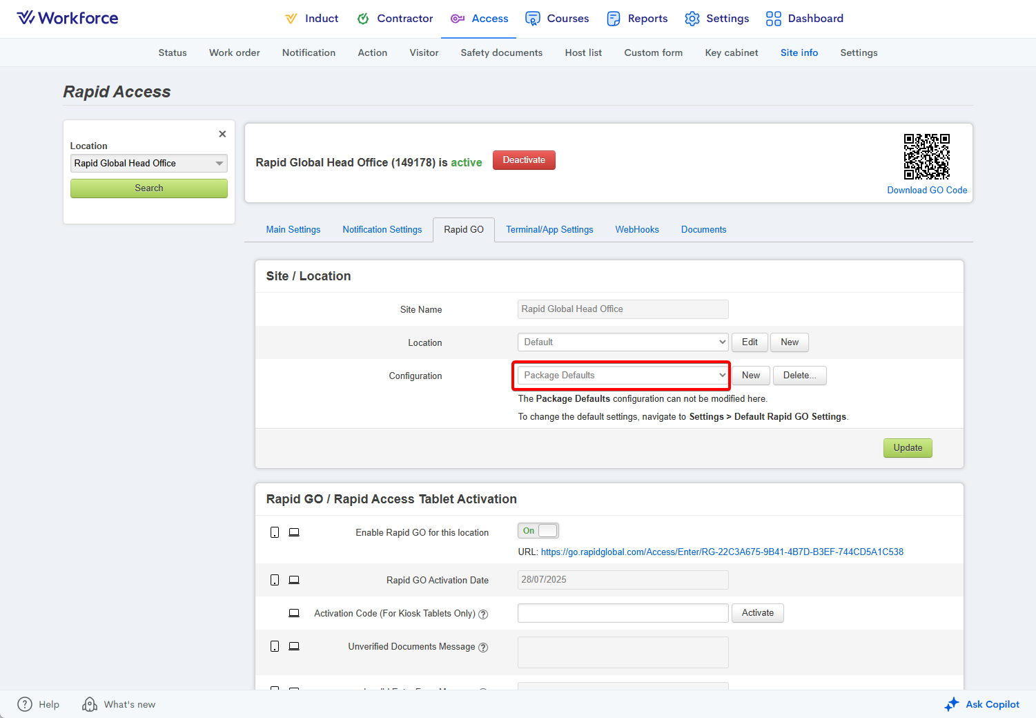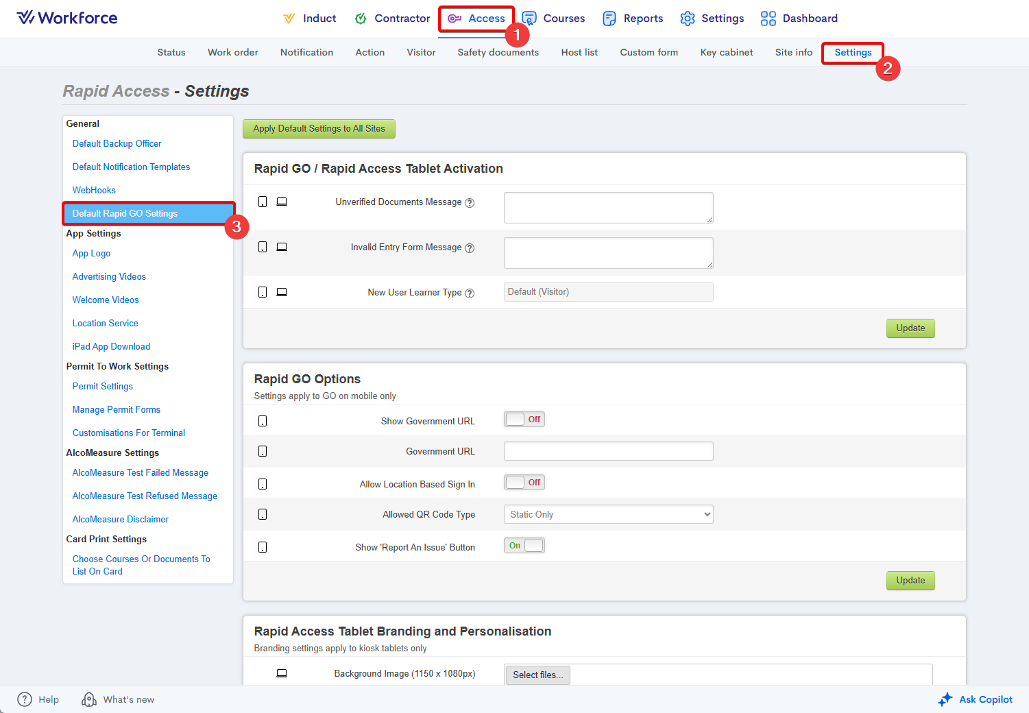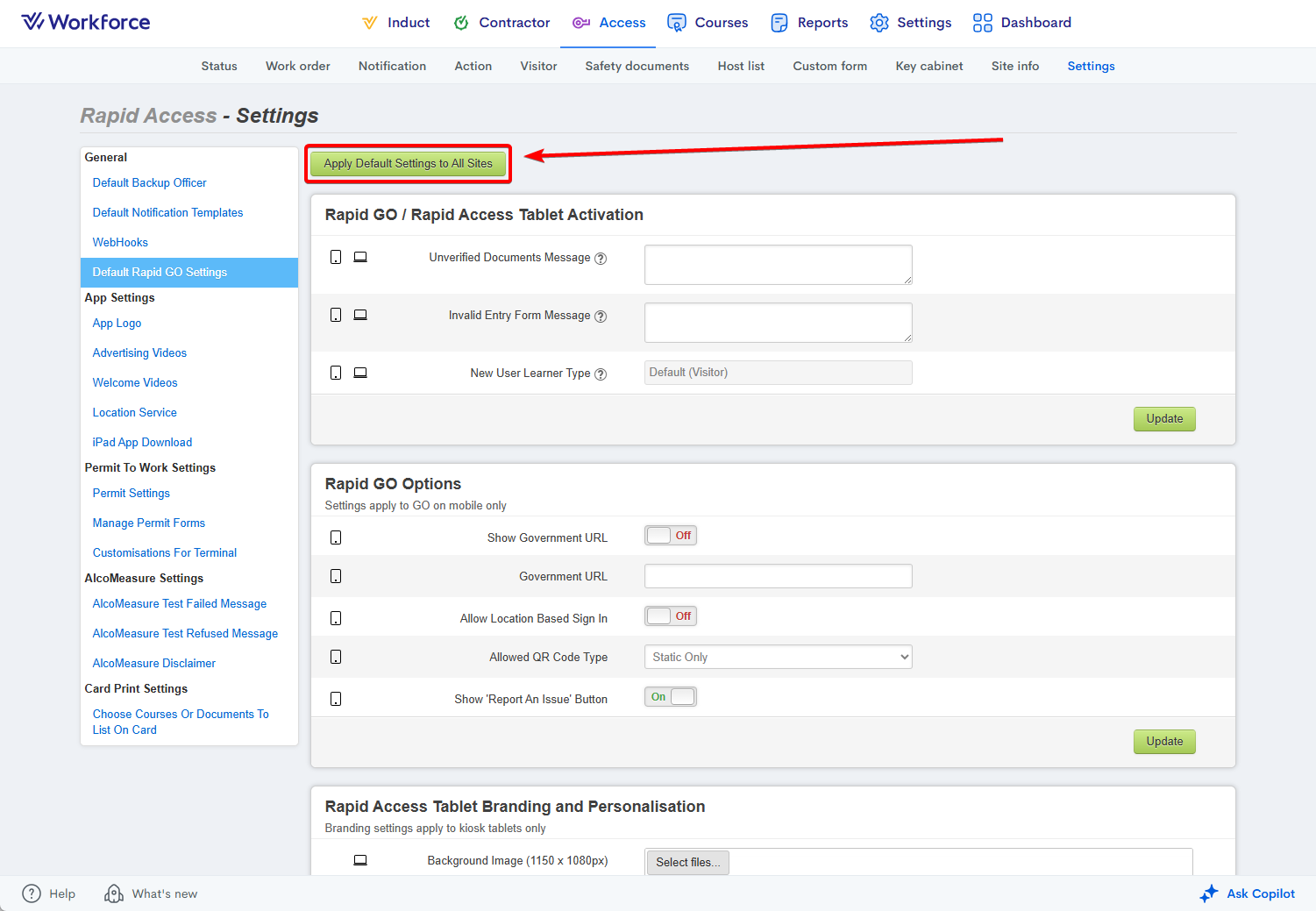 This article outlines the steps to enable label printing when a user signs in using either the iPad or Android tablet or Rapid GO QR code across multiple sites using the 'Default Rapid GO Settings' feature. This will remove the need to manually update the settings for each site.