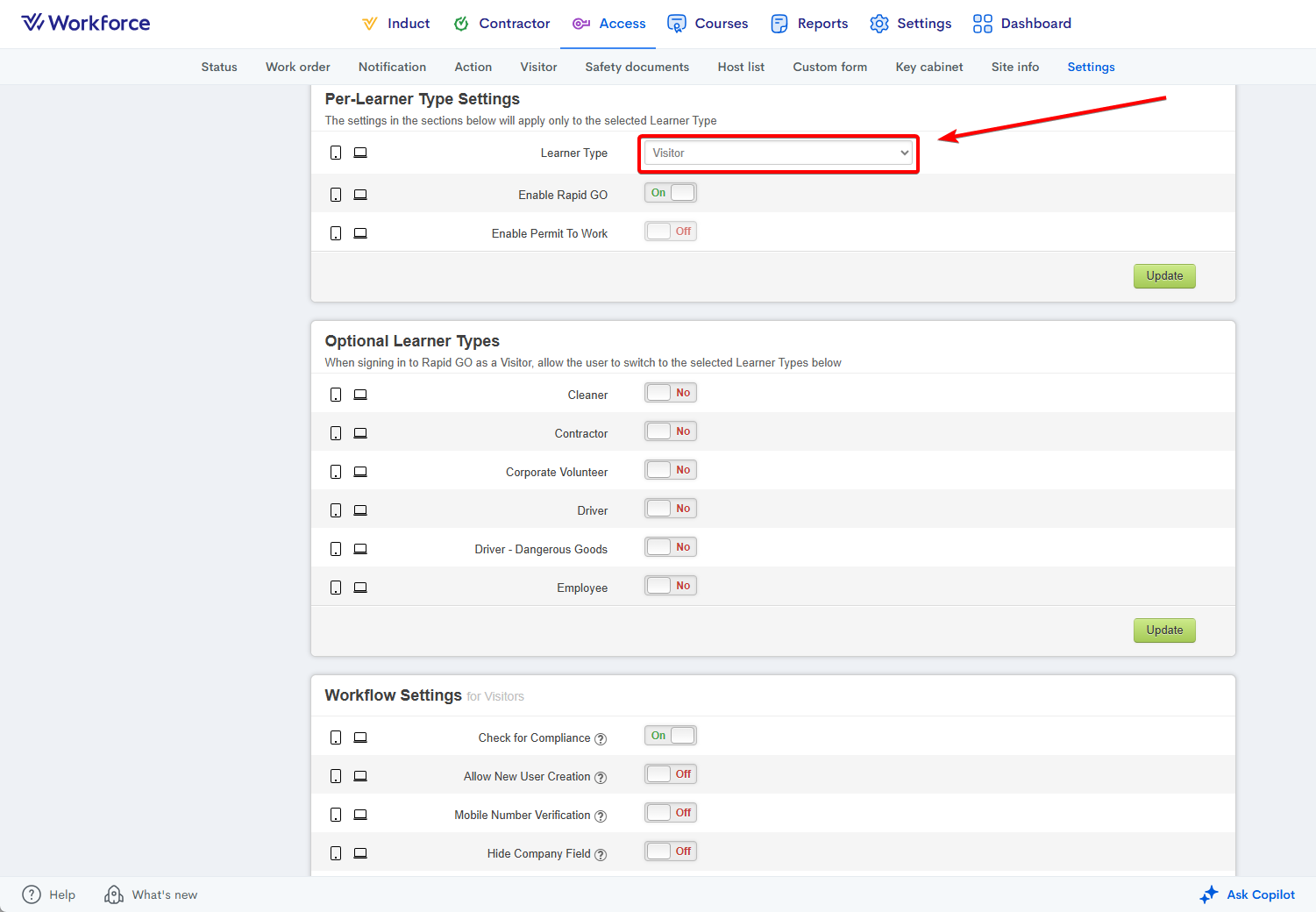 - Select the learner type you wish to enable label printing for from the dropdown.