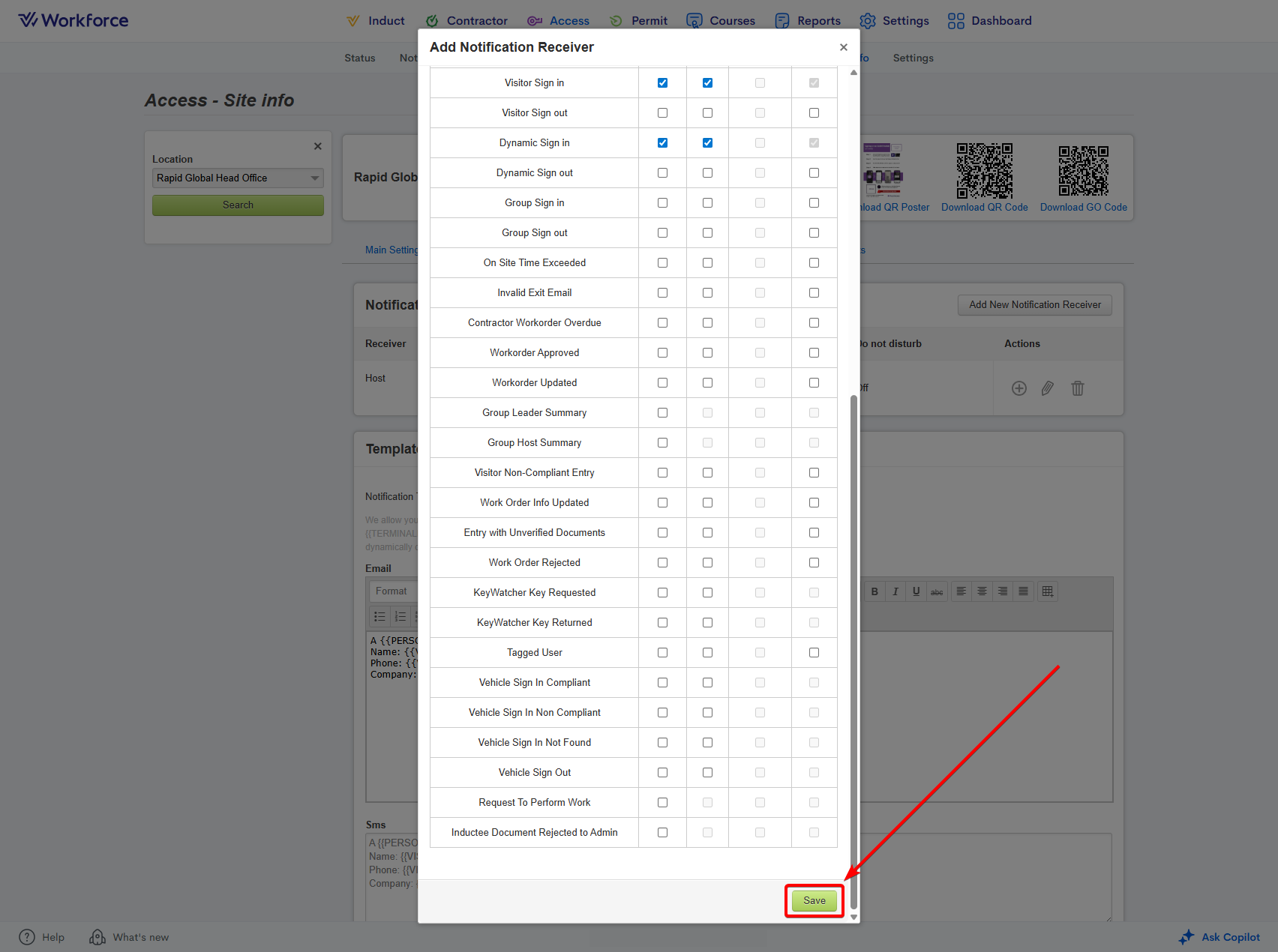 Within Access, site settings can be configured to automatically notify permit approvers when specific work order–related events occur onsite. Go to the Access module. Select the Site Info section. Enter the Notification Settings area. Press the Add ...