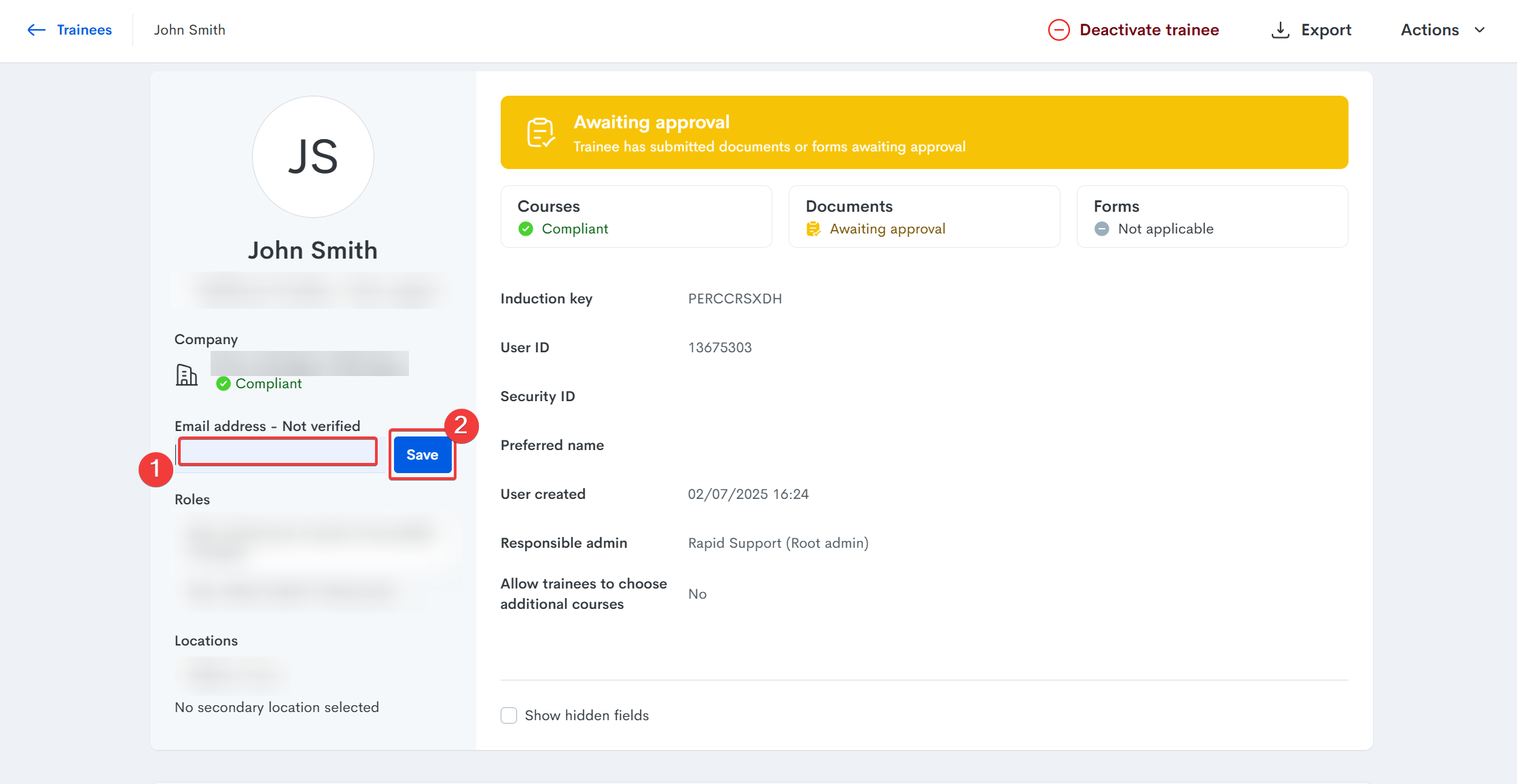 If an inductee has added their induction key to their MyRapid account, you will no longer be able to update the personal details on their Trainee Details page and the trainee will need to update their personal information within their own MyRapid account.