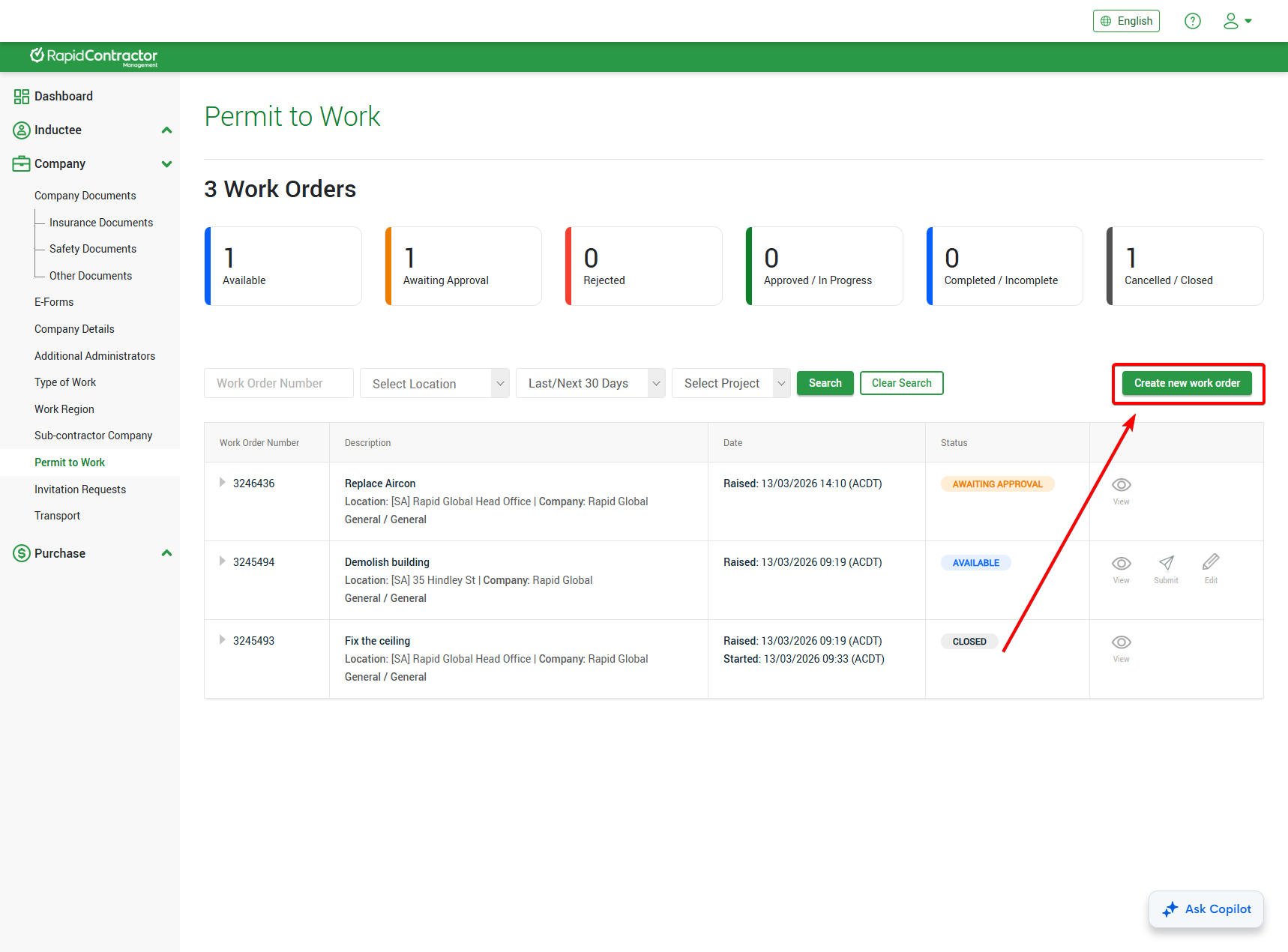 Please note: Some client companies do not allow contracting companies to create work orders. In these cases, you may not see the Create New Work Order button mentioned above. If this applies to you, please contact your client representative to have a work order issued to your team