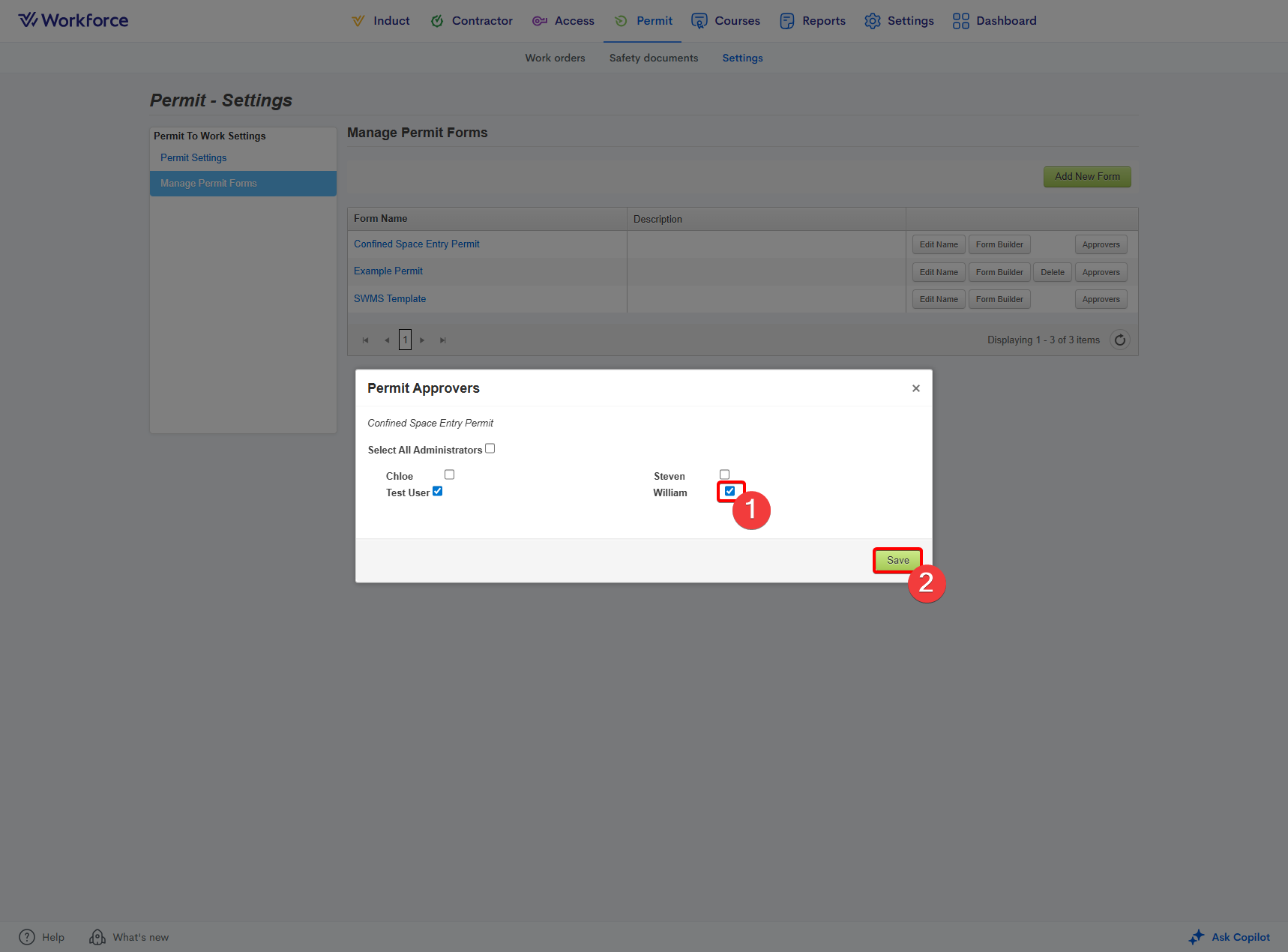 - Click the Approvers button next to the permit you want to add an administrator to: