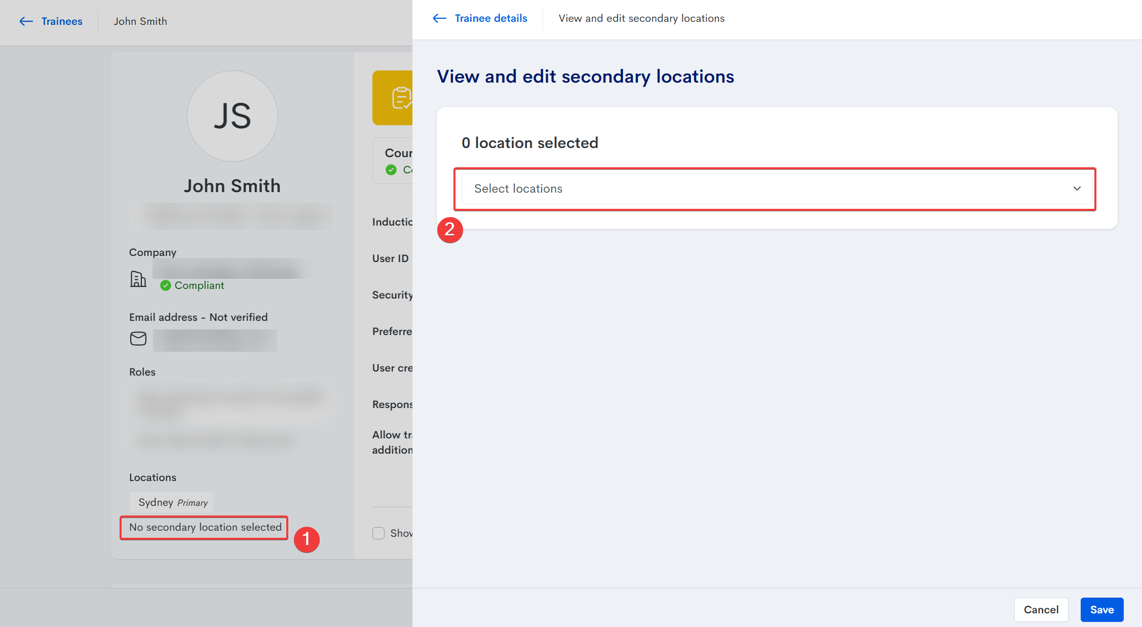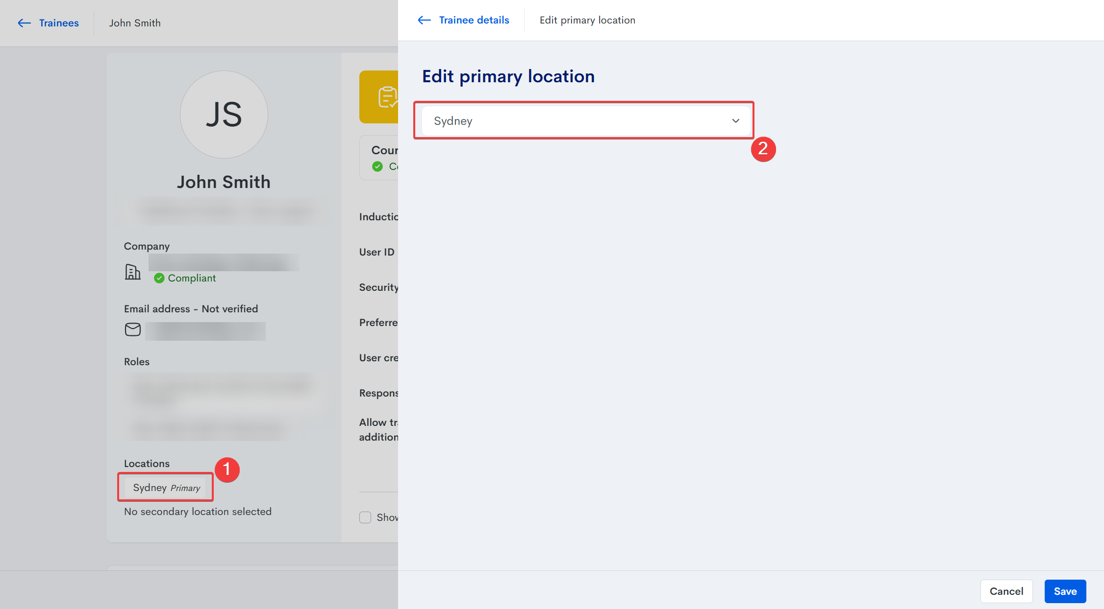 - Click on the trainee’s current “Location” which will allow you to select a new location to replace the existing: