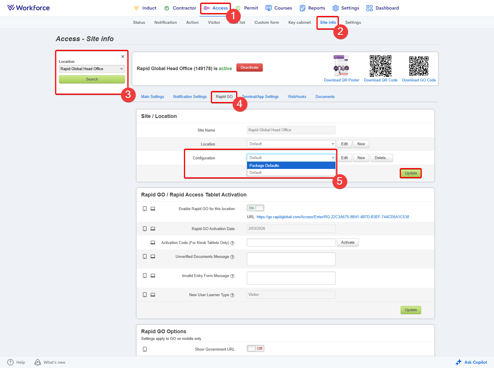 Go to the Access module. Enter the Settings area. Select the Default Rapid GO Settings menu: Enabling Geolocation: Scroll down to the Rapid GO Options section. Enable the Allow Location Based Sign In option. Press the Update button: Adjusting the ...