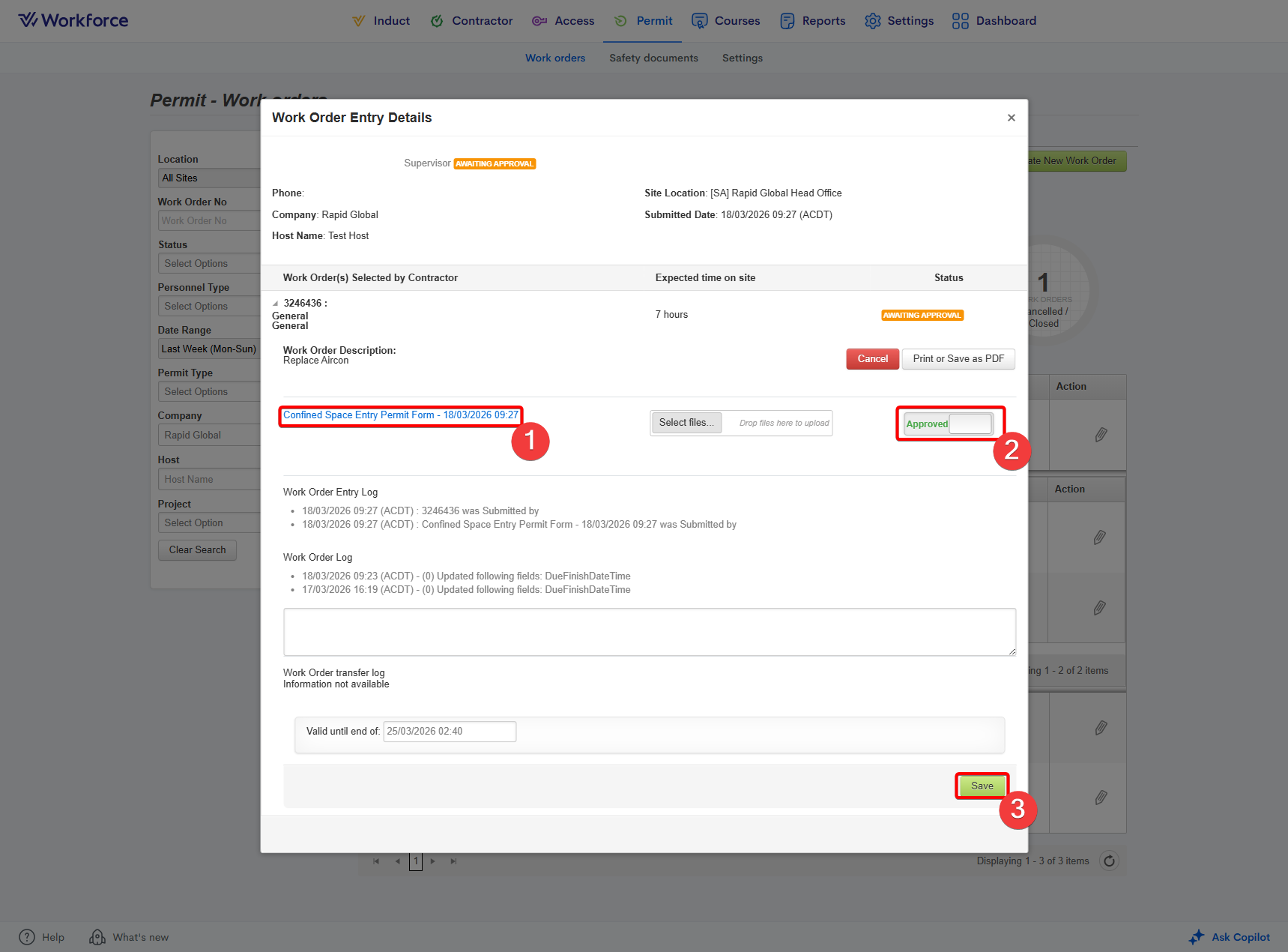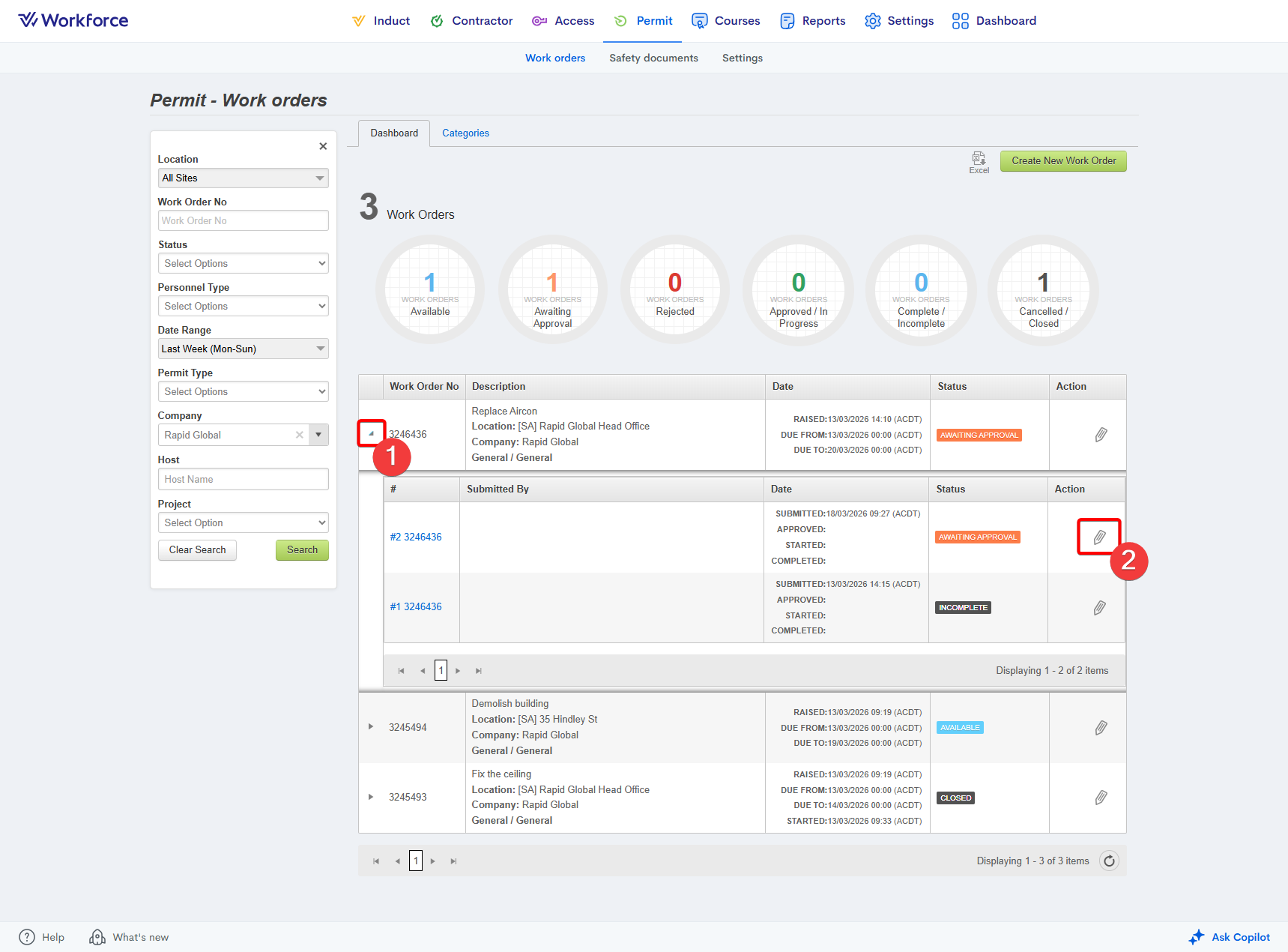 - Locate the work order using the filters on the left-hand side. Ensure you press Search to apply the filters: