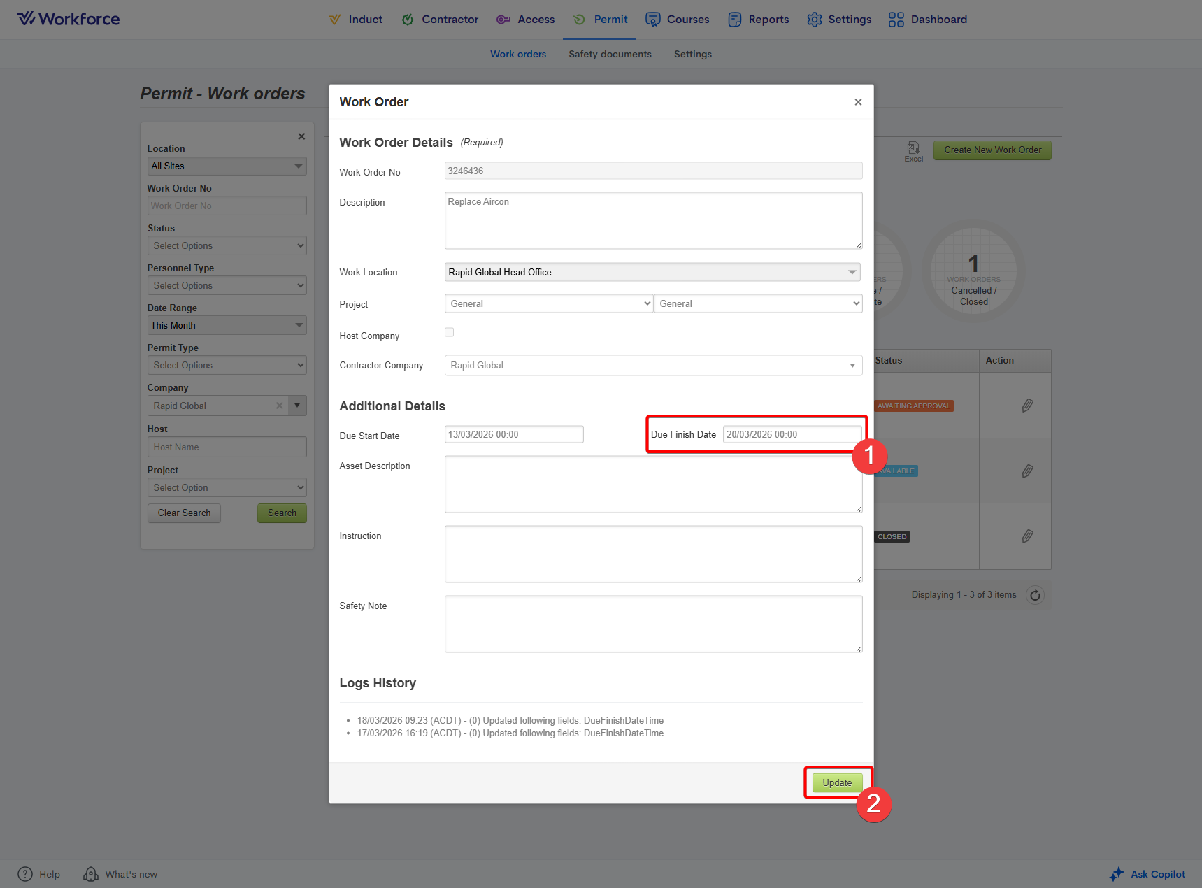 - Locate the work order using the filters on the left-hand side. Ensure you press Search to apply the filters.