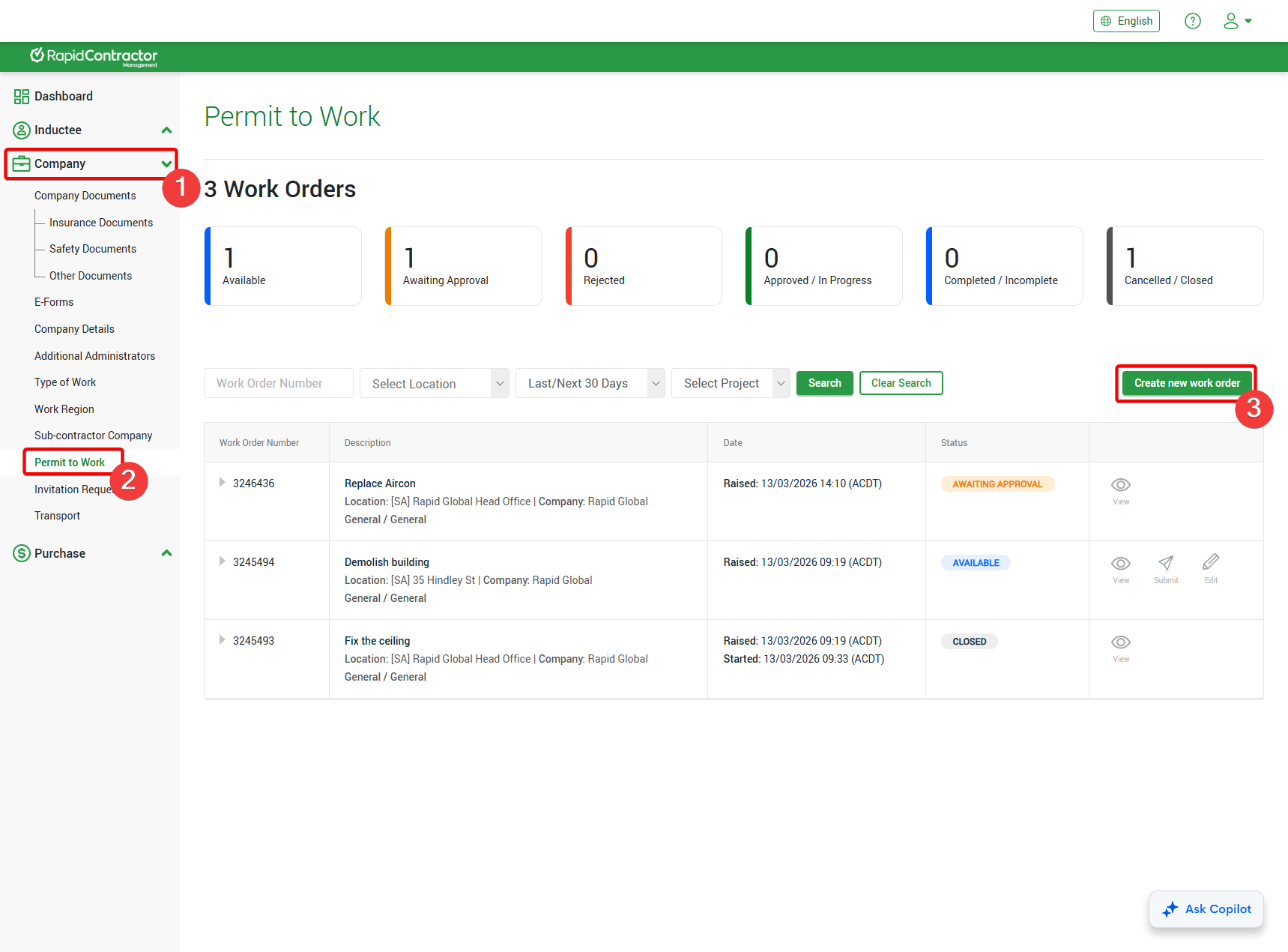 Please note: Contractor administrators may not see the Create new work order option in their portal, as this is controlled by the client’s settings. If this option is unavailable, please contact your client representative for guidance on how work orders should be created.
