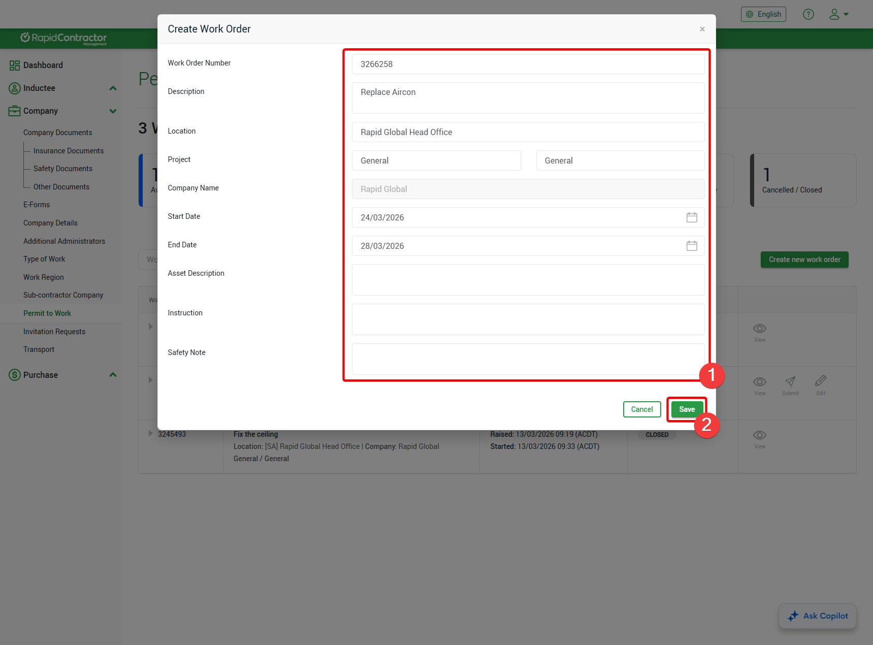 Go to the Permit module. Enter the Work Orders section. Press the Create New Work Order button: Enter the work order's details within the popup. Press Create once the mandatory fields have been populated: Please note: The following fields are ...