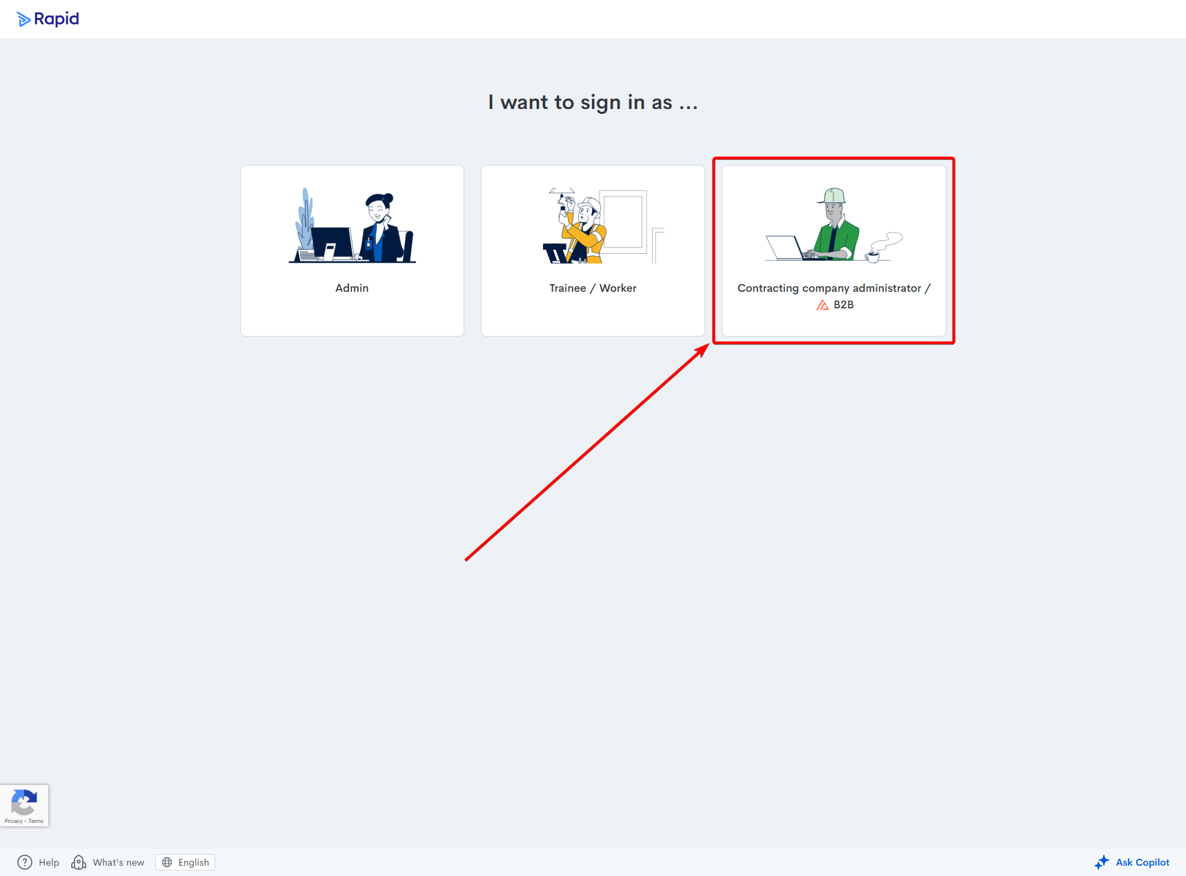 - Press the Contracting company administrator / B2B tile within the sign-in options: