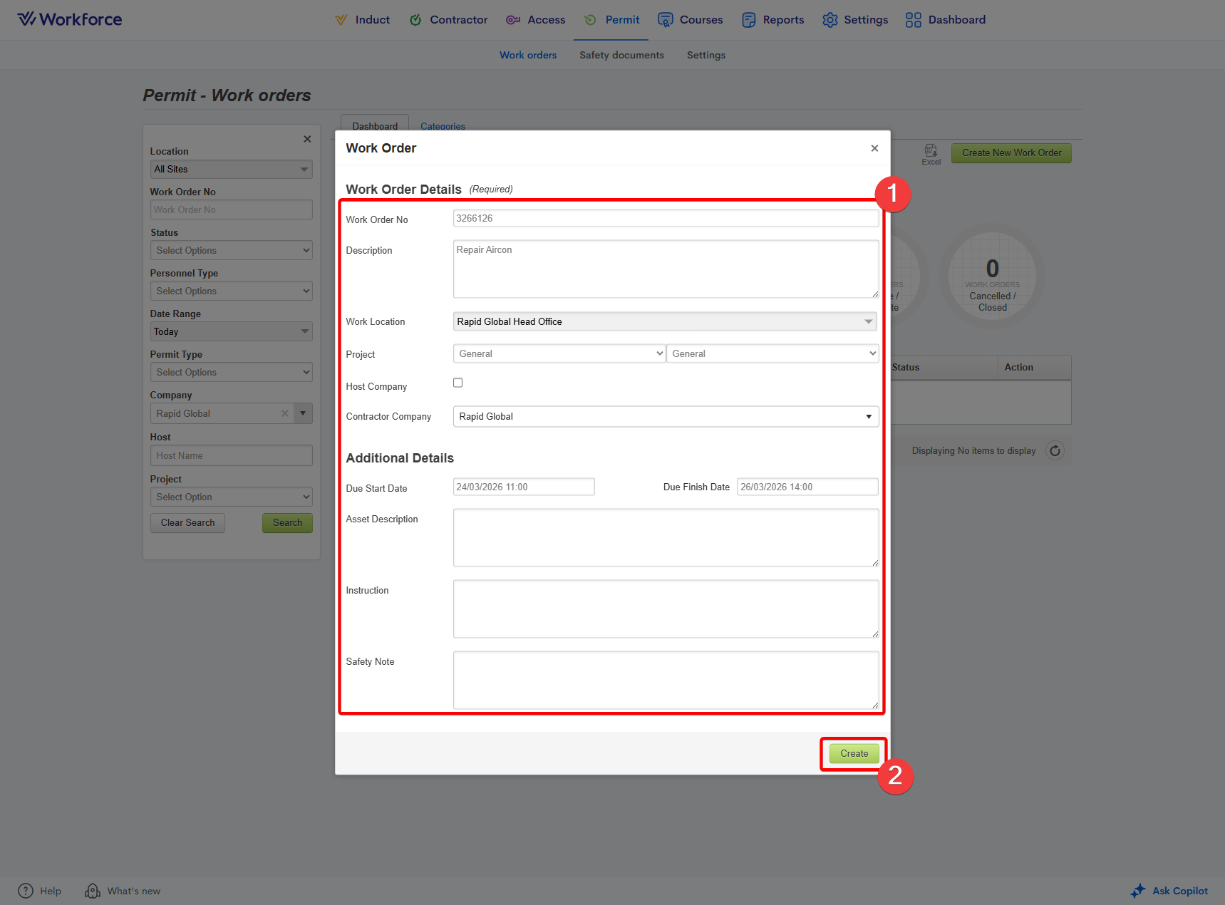 Enter the work order's details within the popup.
