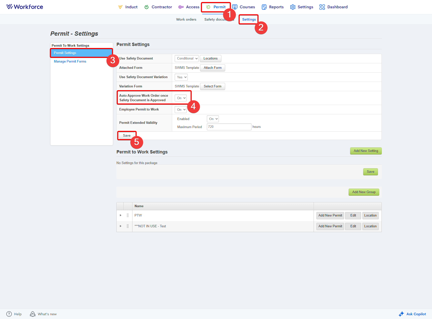 The Auto Approve Work Order once Safety Document is Approved setting, found under Permit > Settings > Permit Settings, allows the system to automatically approve a work order when no items requiring approval (such as permits) are included in the submission, provided the Safety Document has been approved.