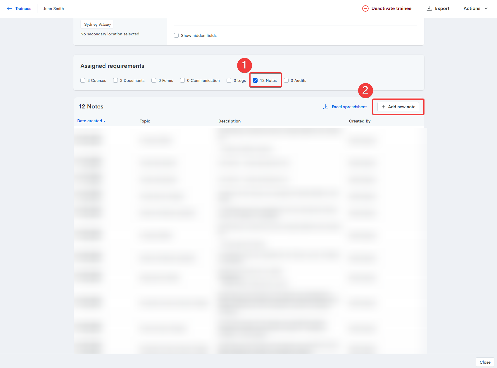 - Select the “Notes” option within the profile, this will display the existing notes > click “+ Add new note” to manually add a new note:
