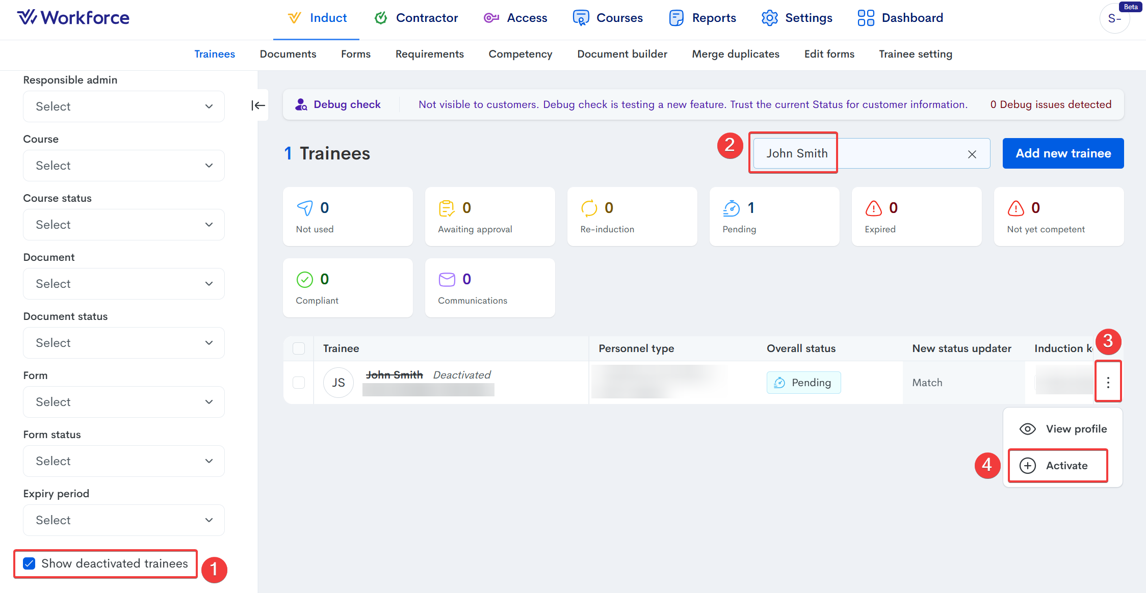 - To find a deactivated trainee, filter by “Active Status” > “Deactivated Trainees”: