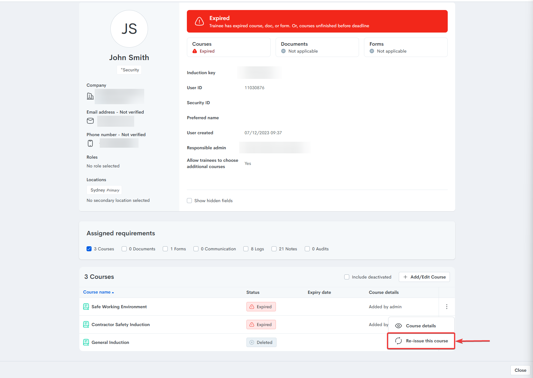 - Within the trainee's “Courses”, select the three dots to the right of the course and select "Re-issue this course":