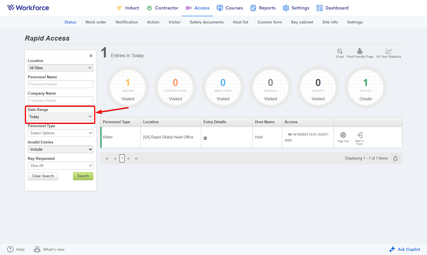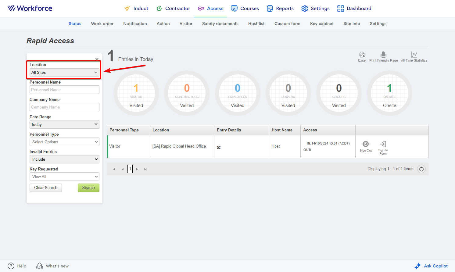 Within the Rapid Access dashboard, you have the ability to review the sign-ins per site allowing you to view personnel who are currently onsite per site. The below instructions will allow you to view visitors, contractors and other personnel who are on site today as well as previously been on site.