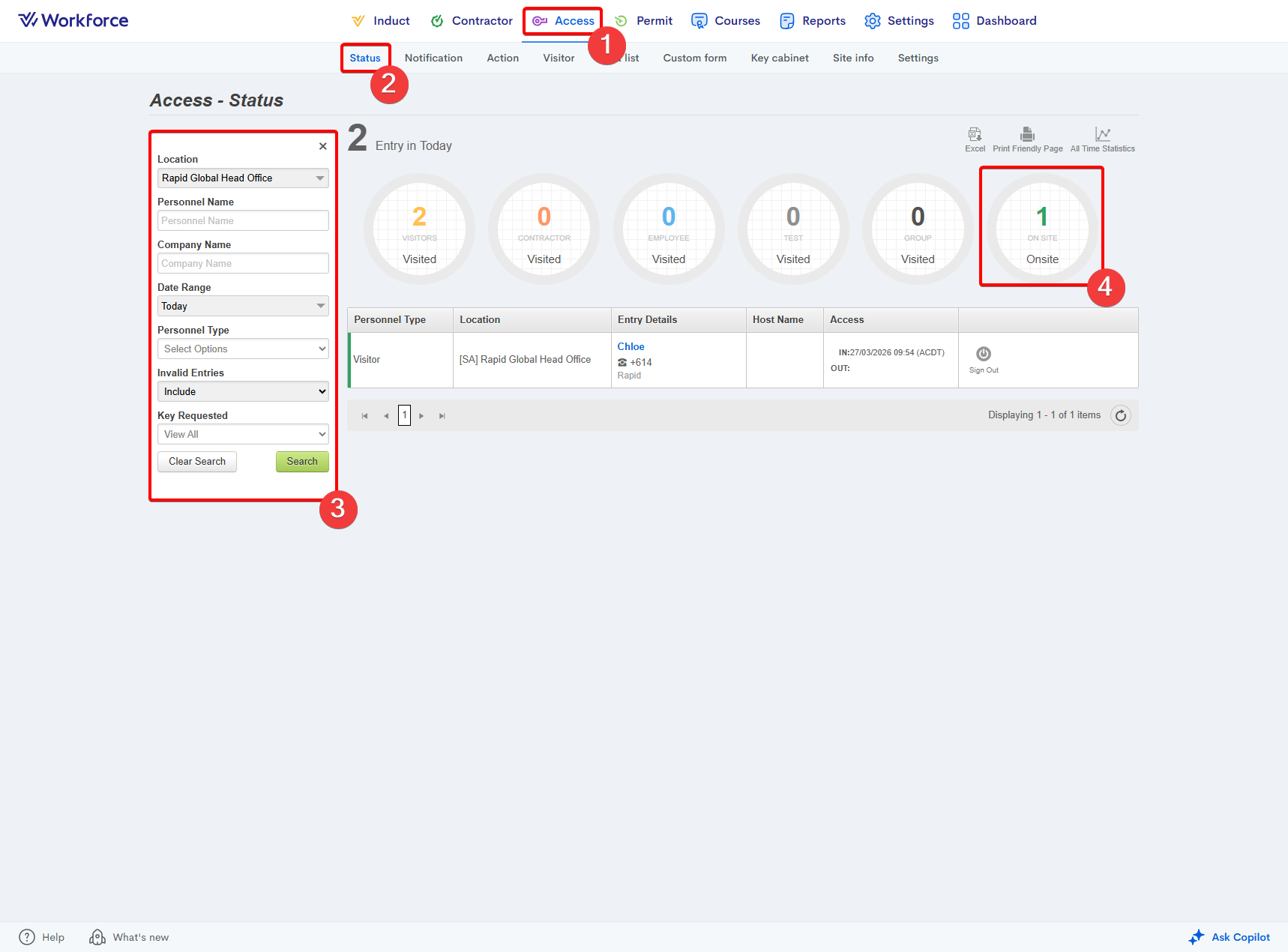 Currently, the Access > Status page does not automatically display a user’s total time onsite. To determine the duration, you must manually compare the sign‑in and sign‑out times and calculate the difference. Alternatively, the Rapid Access Entry Log ...