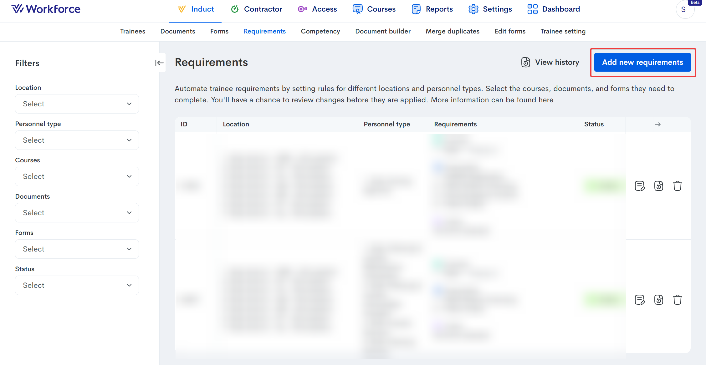 Creating a new trainee requirement Select “Induct”: Select “Requirements”: Select “Add Requirement”: You may now navigate through sections 1-7 relevant to your new requirement and “Save Workflow”: