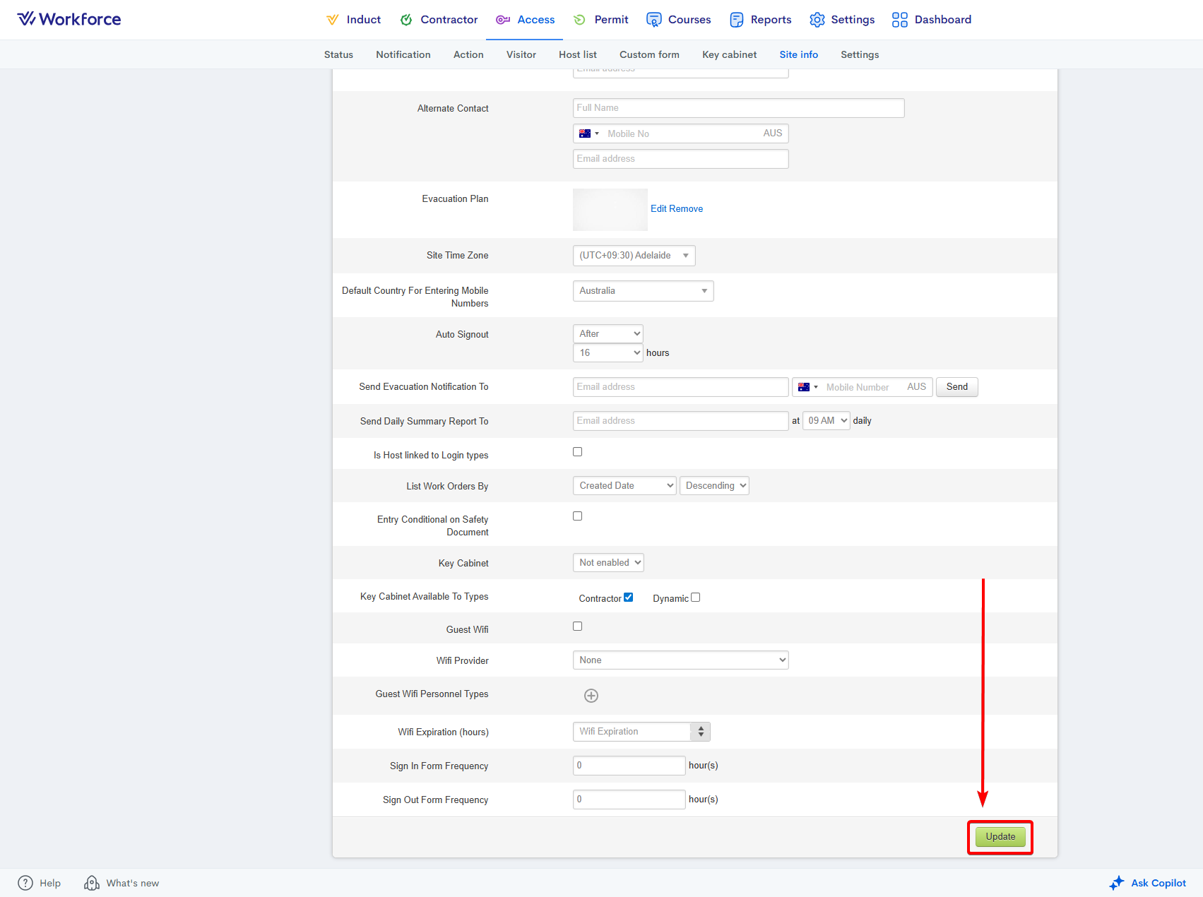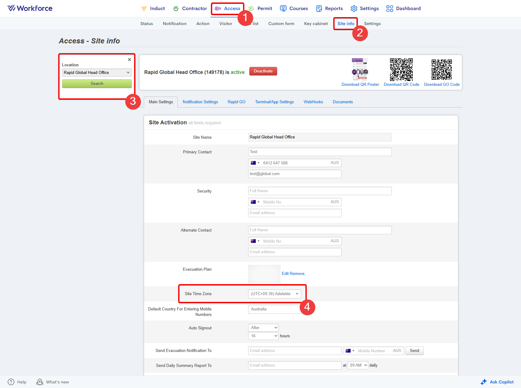 Go to the Access module. Enter the Site Info area. Select your site using the Location dropdown on the left-hand side. Under the Primary Contact field, enter the name, mobile number, and email address of the contact: Scroll down the page and press ...
