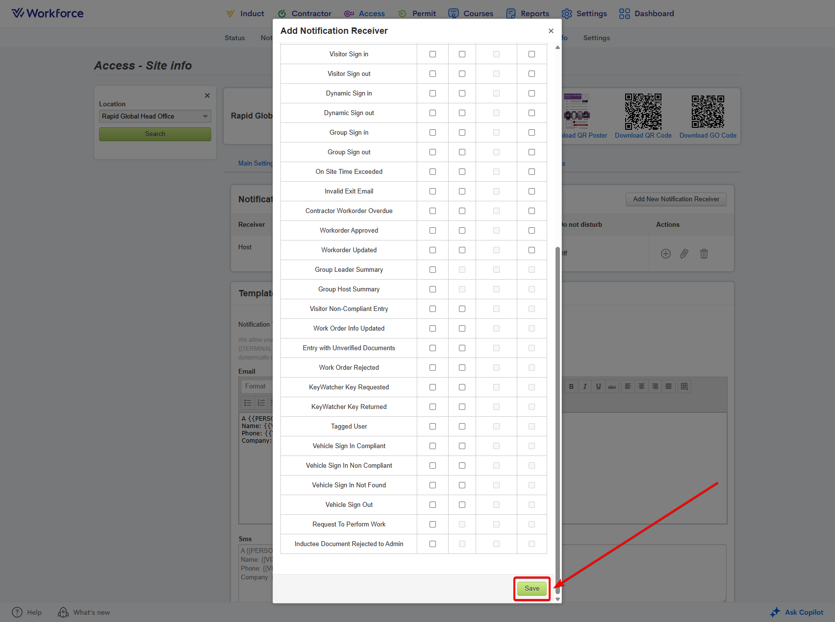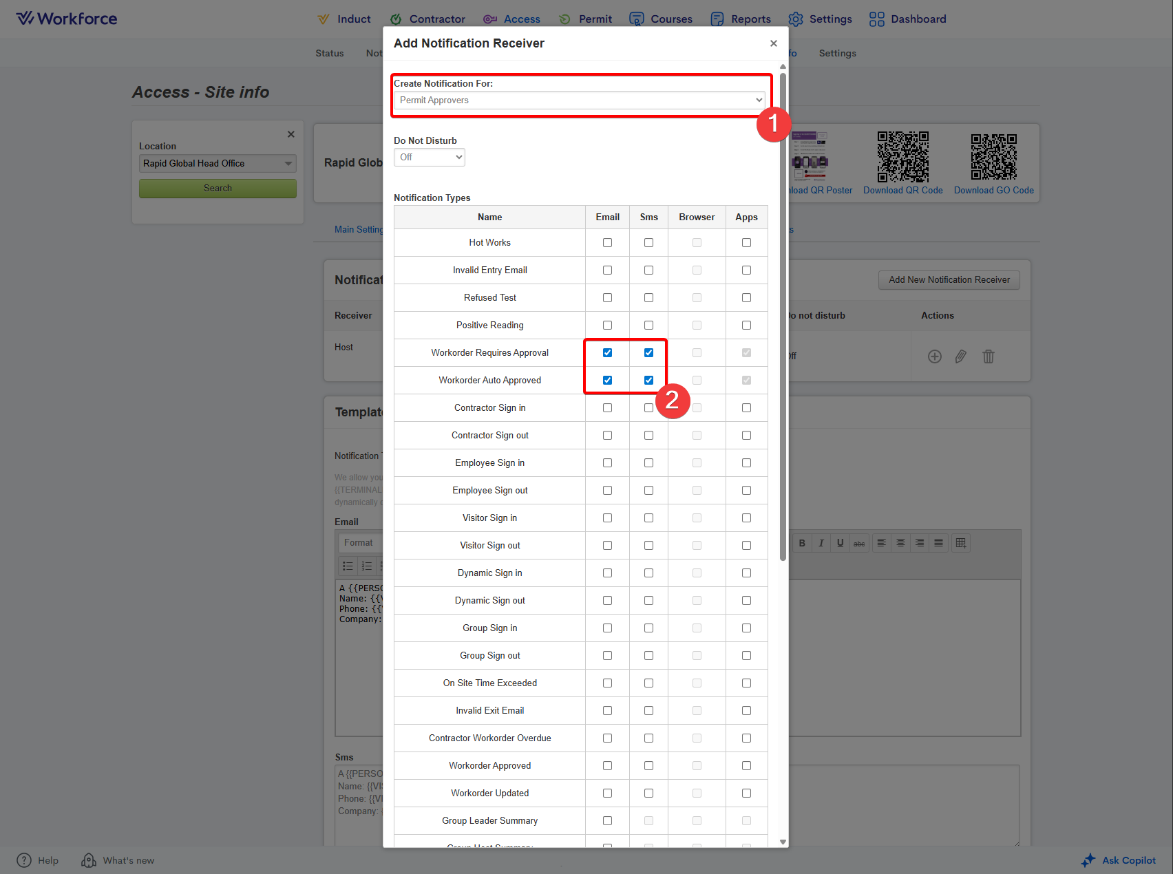 Within Access, site settings can be configured to automatically notify permit approvers when specific work order–related events occur onsite.