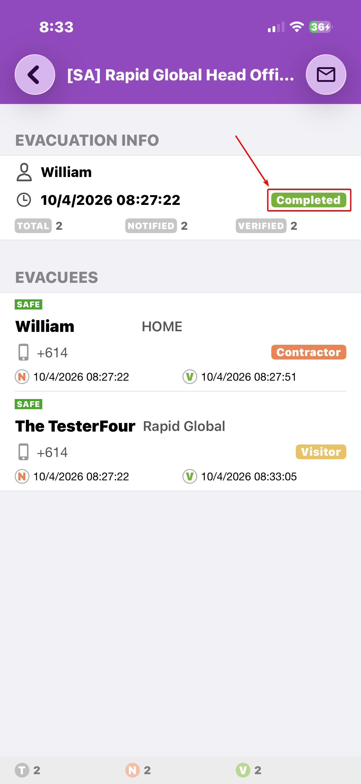 - Once all individuals onsite have responded with Safe, a green Completed textbox will appear at the top right of your screen, indicating that everyone included in the evacuation is safe: