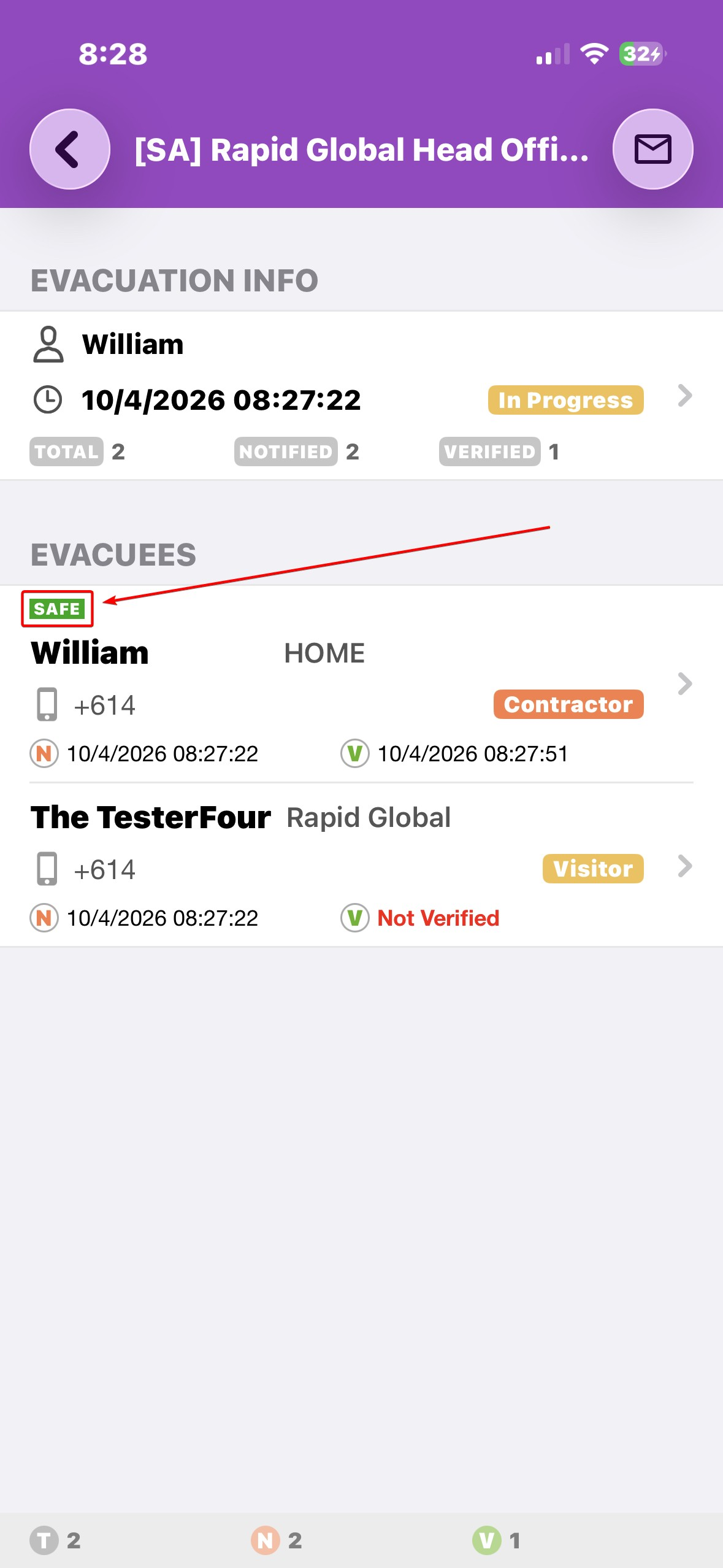 - When an individual onsite responds to the automated message with Safe, a green Safe textbox will automatically appear above their name on the app: