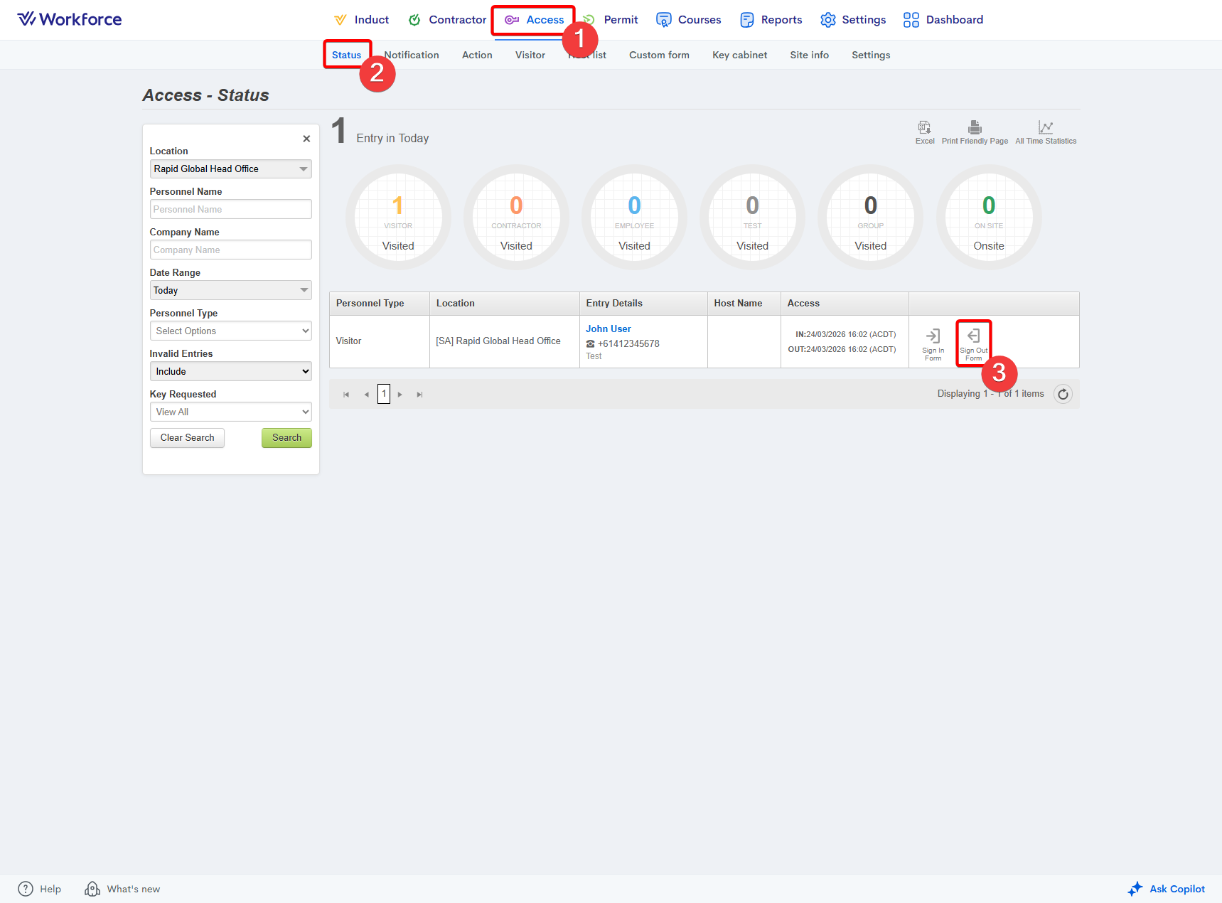 You can access the answers a user has provided to the sign-out form via the Access > Status dashboard. To the right of their entry log, simply press the Sign Out Form button and a popup will appear with their answers.