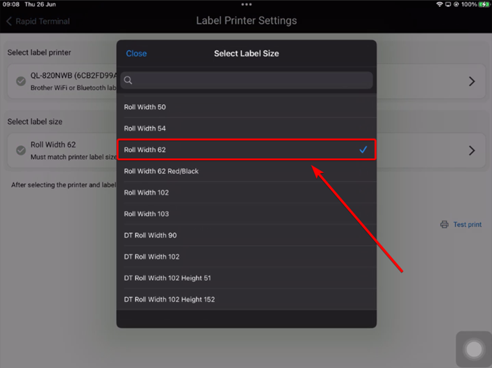 - In the pop-up, select your Brother QL-820NWB printer from the list: