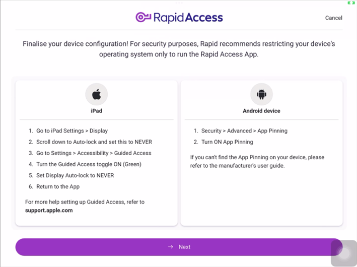 - Follow the on-screen instructions on the iPad to enable Guided Access, or on the tablet to enable App Pinning. This feature restricts users to the 'Rapid Terminal' app, preventing them from exiting or using the device for any other purpose (highly recommended).