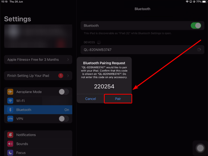 - A pairing code will appear on both the iPad and the printer screen. Verify the codes match, then tap Pair on the iPad: